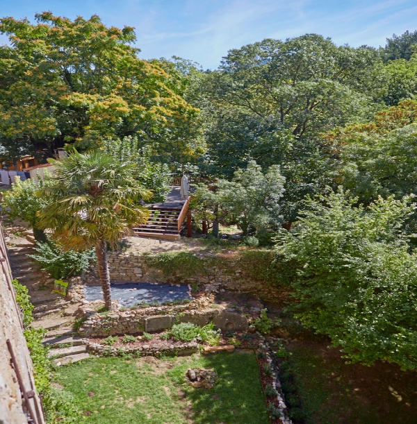 At the highest of the terraces, behind the travertine stone terrace, there is a completely fenced “child” area where children can play safely.